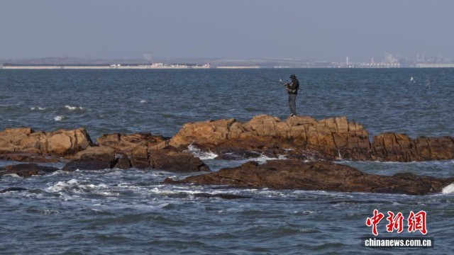 12月1日,山东日照,游客在任家台礁石公园海钓。电视剧《生万物》在此取景,随着该剧热播,吸引了众多游客前来打卡。(无人机照片)