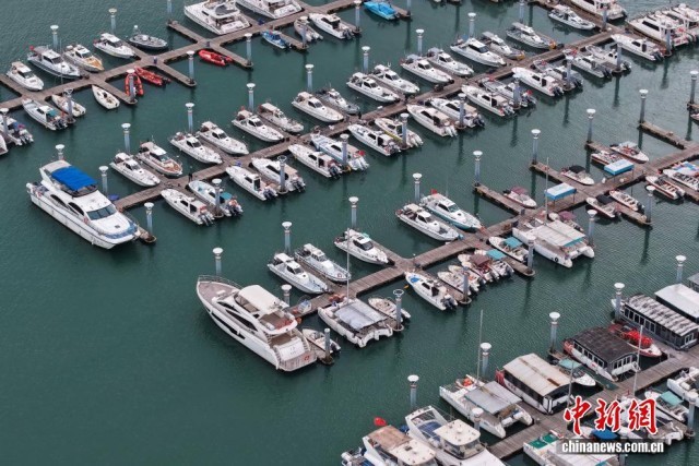 12月1日,山东日照,航拍日照世帆赛基地,游艇停靠在码头。冷空气过境后日照正式入冬,但城市街巷仍留深秋余韵。金色沙滩与碧绿大海交相衬托,各色树叶斑斓交织,色彩错落有致,绘就了一幅如诗如画的自然画卷。(无人机照片)