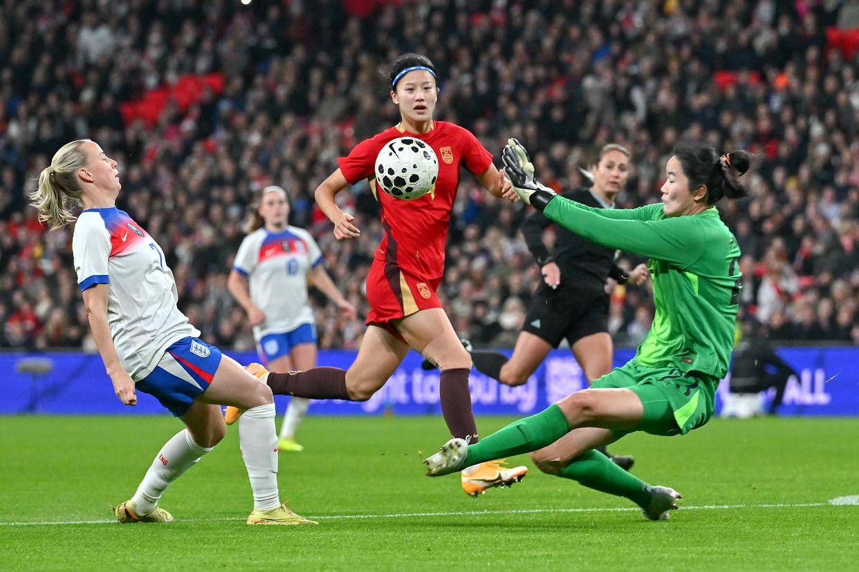 11月29日,中国队门将潘红艳(右)未能扑出英格兰队球员的射门。 新华社记者 李颖 摄 本场比赛之后,中国队将赴西班牙继续拉练,备战明年三月在澳大利亚举行的亚洲杯比赛。