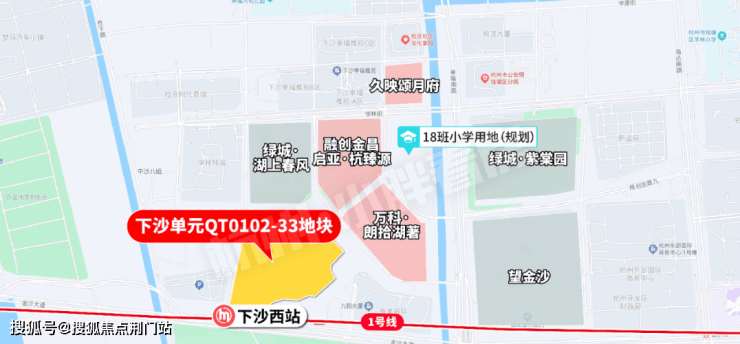 今年1月14日,绿城以201291万元的总价,2.344万/平的楼面价,41.5%的溢价率,高价竞金沙湖北面核心地块,地块名曰:下沙单元QT0102-33地块;也就是现在的绿城湖映金沙轩项目。