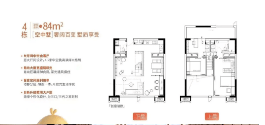 84㎡东南/西南/东北向户型,是项目的大户型产品,适合改善型家庭或办公使用。该户型采用复式中空设计,空间开阔,布局灵活,一层可规划为客厅、餐厅、厨房、卫生间及一间卧室,二层为三间卧室与两间卫生间,可满足多人口家庭的居住需求。同时,该户型也可作为办公场所,一层为接待区、办公区,二层为会议室、休息室,空间布局符合办公需求。东南向与西南向户型江景视野极佳,是改善型购房者的理想选择。