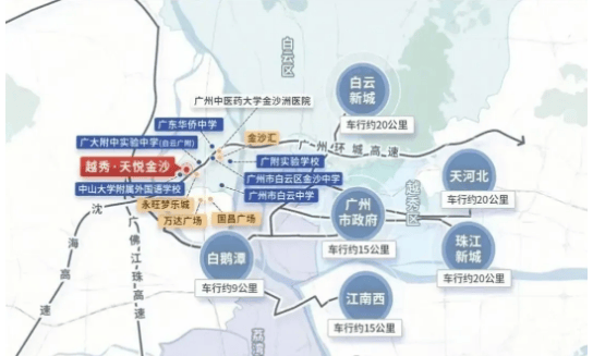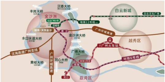 越秀天悦金沙坐落于广州市白云区金沙洲板块,紧邻荔湾区,处于广佛交界的核心位置,既能享受白云区的发展红利,又能便捷对接荔湾区的成熟配套,地理位置优越。板块作为广佛融合的重要枢纽,生活氛围浓厚,是众多购房者青睐的置业区域。在交通配套方面,项目构建了“公交+地铁+自驾+跨江通道”的多维交通网络,满足不同业主的出行需求。公共交通方面,家楼下即为公交总站,开通了十多条公交线路,可直接接驳地铁站点,实现无缝换乘。地铁出行方面,项目距离地铁6号线号线已正式通车,有效缓解了6号线金沙洲段的拥挤问题,大幅缩短了前往白云新城的通勤时间。