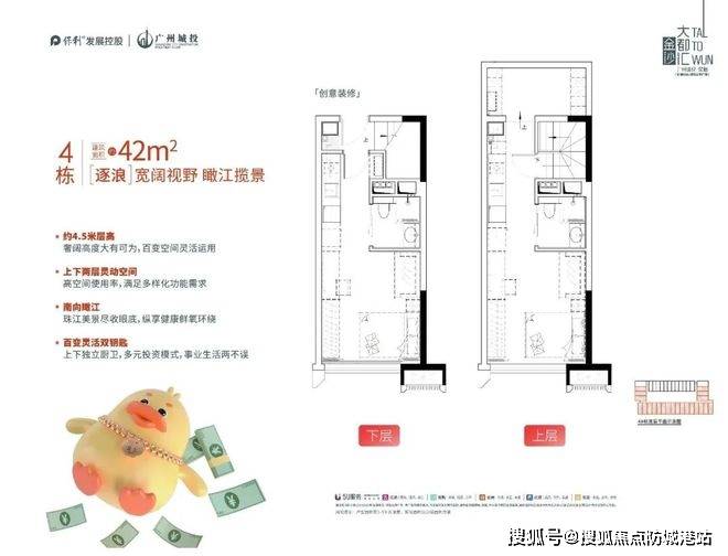 户型方面,建面约 30 - 42㎡的空间,看似不大,实则百变。约 4.5 米的挑高,让空间有了更多可能性。双钥匙设计,上下两层互不干扰,可灵活安排使用。这种户型设计不仅提高了空间利用率,还满足了不同的生活和投资需求。相比同类型产品,性价比极高,花一份钱,得到两份空间和收益,无论是单身人士自住,还是投资者入手,都极具吸引力,真正做到了小空间大价值。