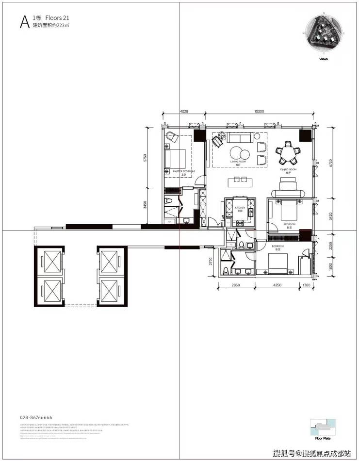 A户型:10米奢华开间、约7米超深进深、270º湖滨视野、三室两厅三卫一厨