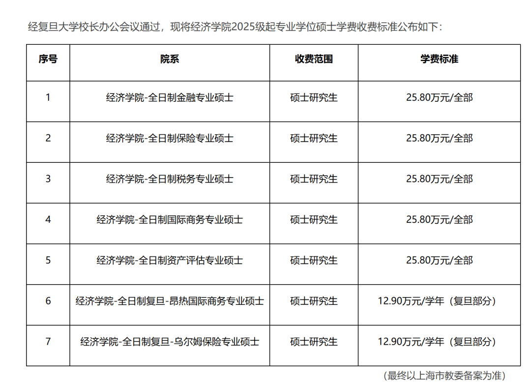 保险、税务、国际商务等专业在学费这块也是称王称霸,令一众保研er大呼“要想学商务,得先有钱学商务”。再看看复旦大学经院放出的专硕学费收费标准,几乎都是二十万起底,从原来的21.8万/全部,涨至如今的25.8万/全部,足足涨了四万。此刻才明白“读研读到破产”这句话丝毫没有夸张。