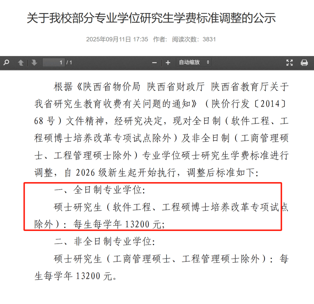 今年9月,西安电子科技大学发布公告称将对部分专硕进行学费调整,统一上涨为每生每学年13200元(软件工程、工程硕博士项目除外),而在此之前,西安电子科技大学的专硕与学硕学费一致,均为每学年8000元。