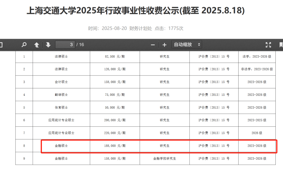 图源:上海交通大学2025年行政事业性收费公示(截至 2025.8.18)