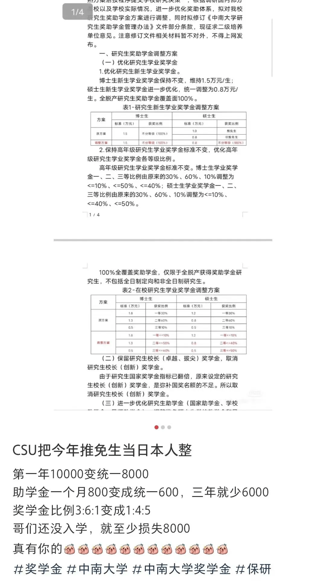 再比如,今年3月,中南大学也传出了奖学金调整的消息,研一学年推免生由原来的1w变为了8k,奖学金比例调整为一等奖学金10%(原30%),二等奖学金40%(原60%),三等奖学金50%(原10%)。