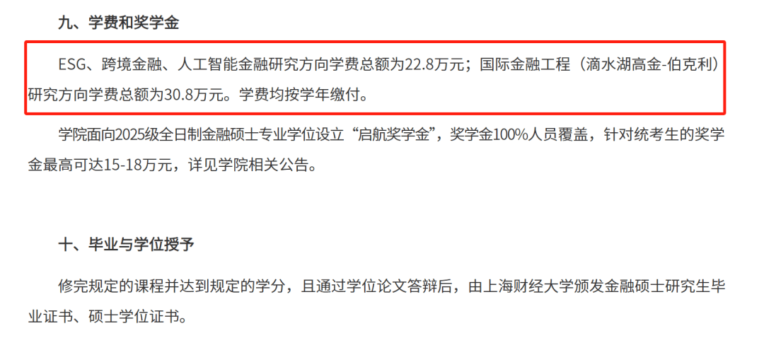 而在众多专业中,学费上调的“重灾区”就是经管类专业,学费上调消息对这些专业的保研er们来说无疑是一把利刃,例如上交金融硕士的学费高达18.8万;上财ESG、跨境金融研究方向专硕学费已经来到了22.8万元,国际金融工程方向专硕的学费更是达到了惊人的30.8万,完全不输留学费用!