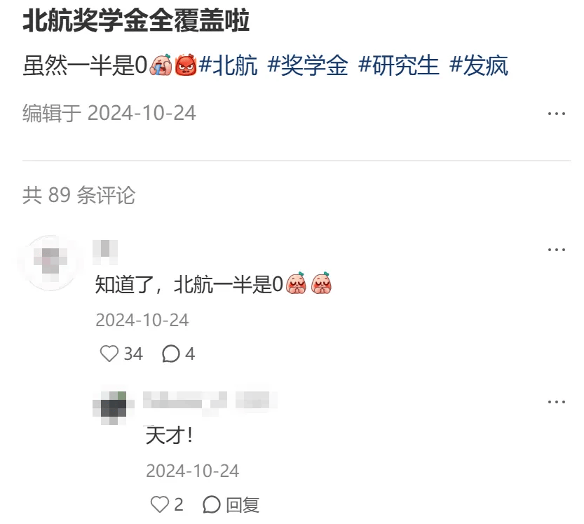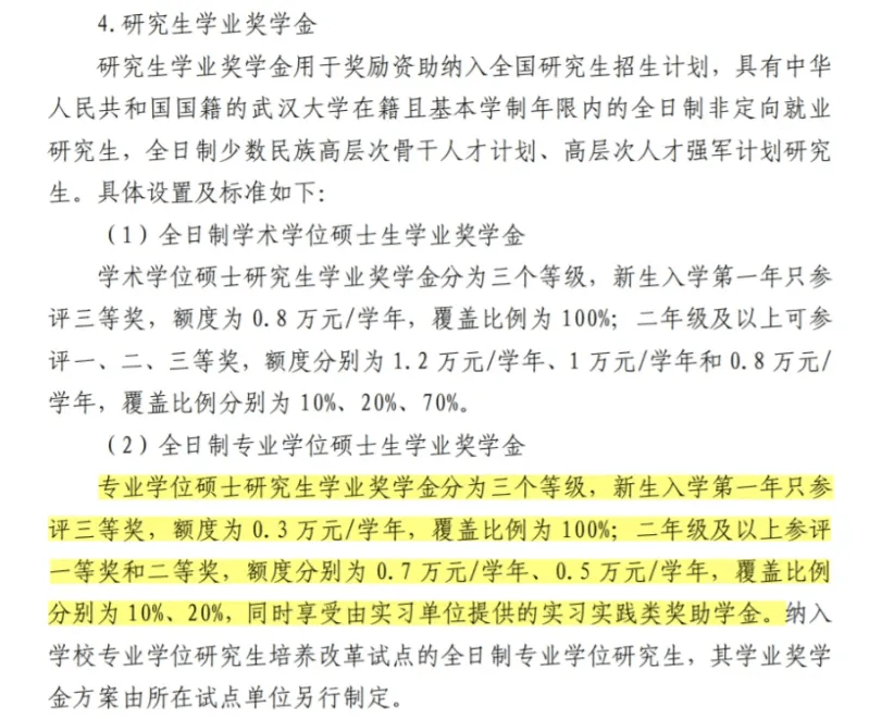 2024年10月北京航空航天大学传出“奖学金全覆盖,但一半是0元”的大调整;同月,武汉大学也传出专硕学业奖学金额度和比例均大幅下调的消息:一二三等奖分别为0.7万、0.5万、0.3万。