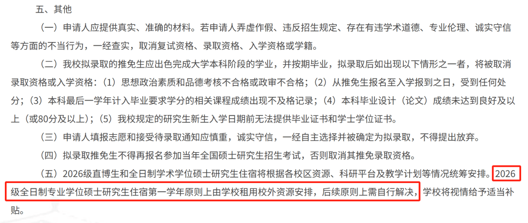浙江大学于2026年招收推荐免试研究生办法中提到“专业学位硕士研究生第一学年的住宿由校方租用校外资源安排,后续需自行安排”。
