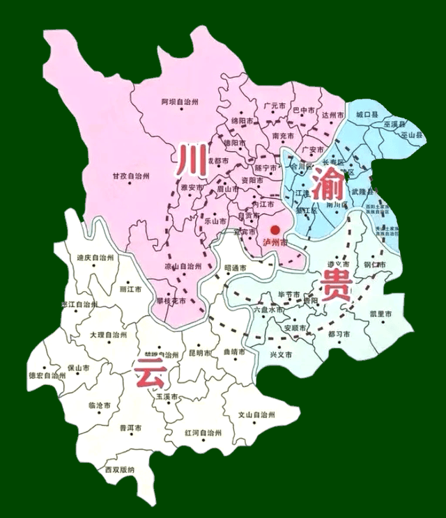川以前还包括今重庆直辖市。1997年,重庆及周边地区从四川析置为直辖市,简称“渝”,此后“云贵川”也常被称作“云贵川渝”。该区域面积广阔,地理与人文风貌极其多元,也是充满活力的经济区域,为中国面向南亚东南亚开放的前沿门户。
