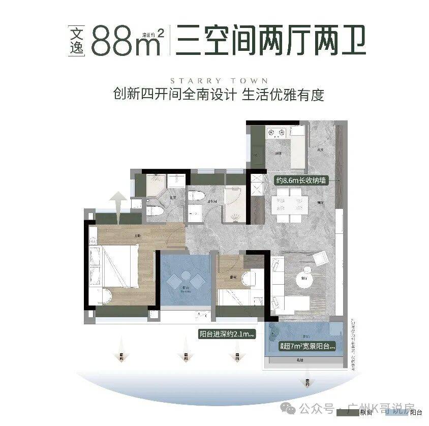 在售建面约88-125㎡三至五空间,户户朝南,皆为270°宽景大阳台,4-4.5面宽朝南,高使用率产品。