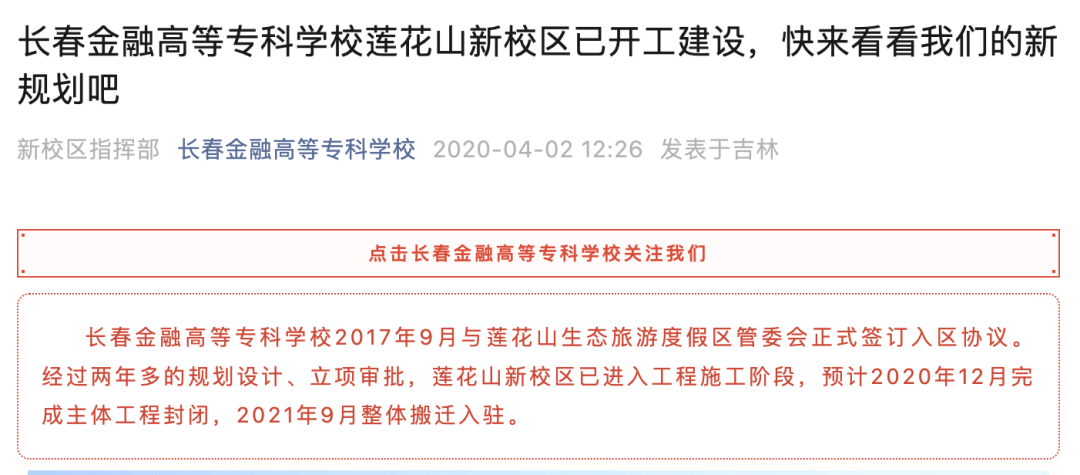 据了解,长春金融高等专科学校新校区坐落于素有“天然氧吧”之称的长春莲花山生态旅游度假区,环境优美、生态宜人,是名副其实的山水校园。