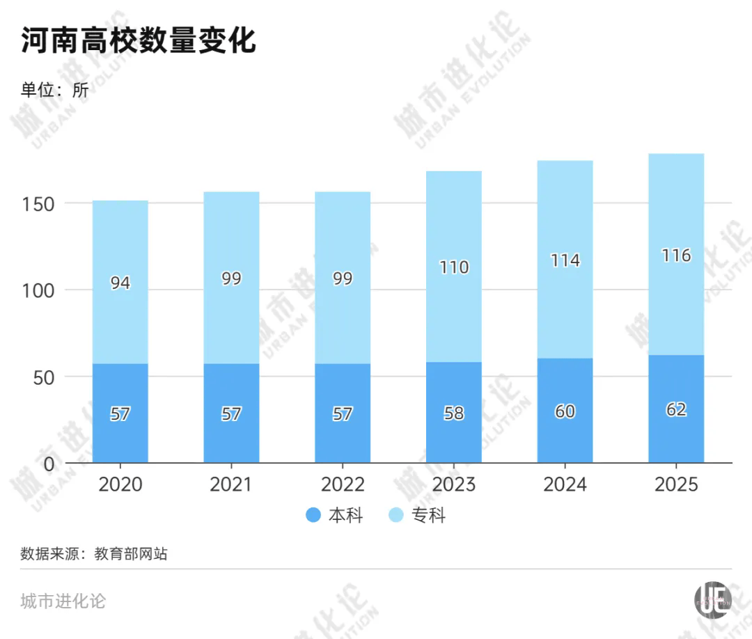 2025年,河南专科院校116所、居全国之首,在全省高校中占比65%。而同样是高校大省的江苏、山东、广东,专科院校占比均在55%左右,比河南低了近10个百分点。