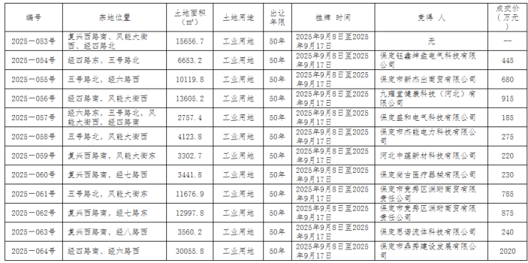 2025年9月18日,保定市公共资源交易中心公布了一则国有建设用地使用权拍卖出让结果公示,主城区1宗工业用地成功出让,1宗工业用地流拍。钰鑫坤垚电气、新杰出商贸等公司拿地。