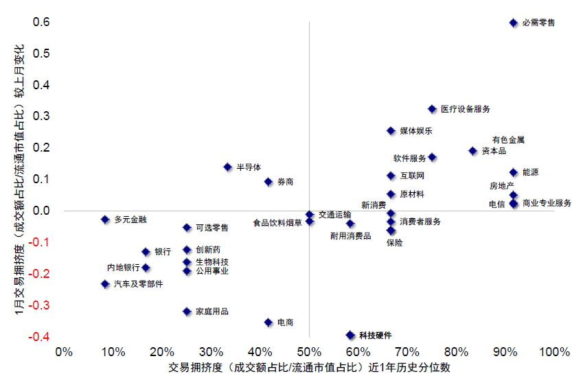基本面弱,交易活跃:短期交易机会。资金交易维度配置价值高、但基本面打分偏低,如房地产、能源、软件服务、耐用消费品、食品饮料烟草等,这些板块阶段性受到资金追逐,交易活跃且不至于过热,但估值盈利性价比偏低,盈利修复不足,更偏向事件或情绪驱动的交易机会,持续性和中长期配置属性相对有限。近期地产等国内政策态度的边际变化使得消费和地产板块情绪改善,政策催化带来交易性机会。往前看,短期波动较大加上春节临近的各种数据和叙事下,或促使部分资金去消费腾挪避险。