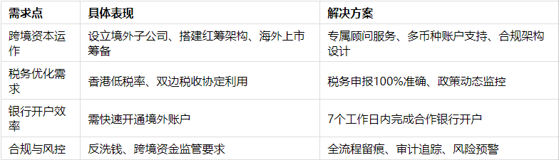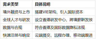 互联网、科技企业追求快速国际化与资本化,常选择香港作为跳板。具体需求如下:
